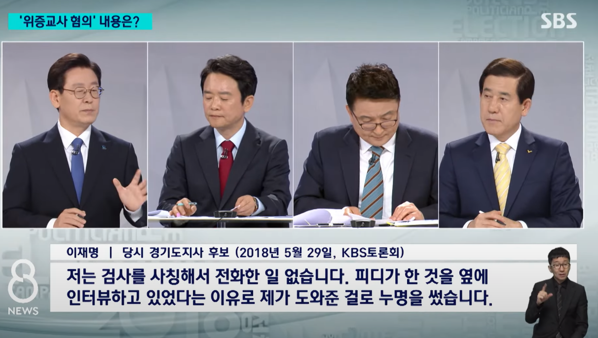 2019년 2월 허위사실공표 혐의 재판에 증인으로 출석한 김 씨가 "당시 성남시장이 이재명을 검사 사칭 주범으로 몰기 위해 KBS PD 고소는 취하하자는 의견이 있었다"라고 증언한 것이 이재명이 교사한 위증이라고 검찰은 판단했습니다.