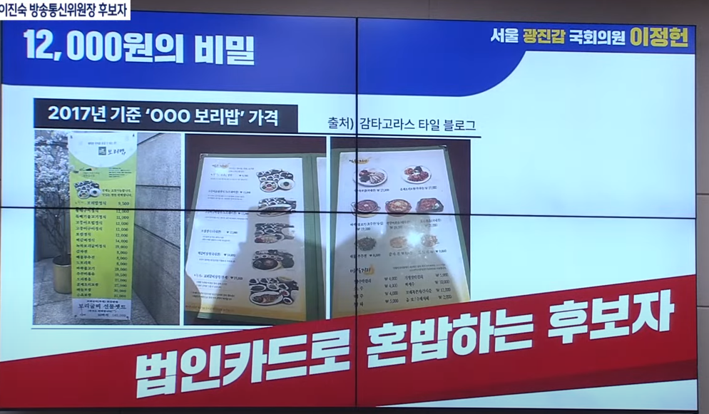이후 보자가 주말에 법인카드를 사용한 액수는 8,500만 원 건수는 342건이라며 사적사용으로 의심사례는 한남동 고급호텔, 한정식집, 이대 앞 아인다이닝, 경기 파주 장어집, 논현동 고급호텔, 등이라고 합니다