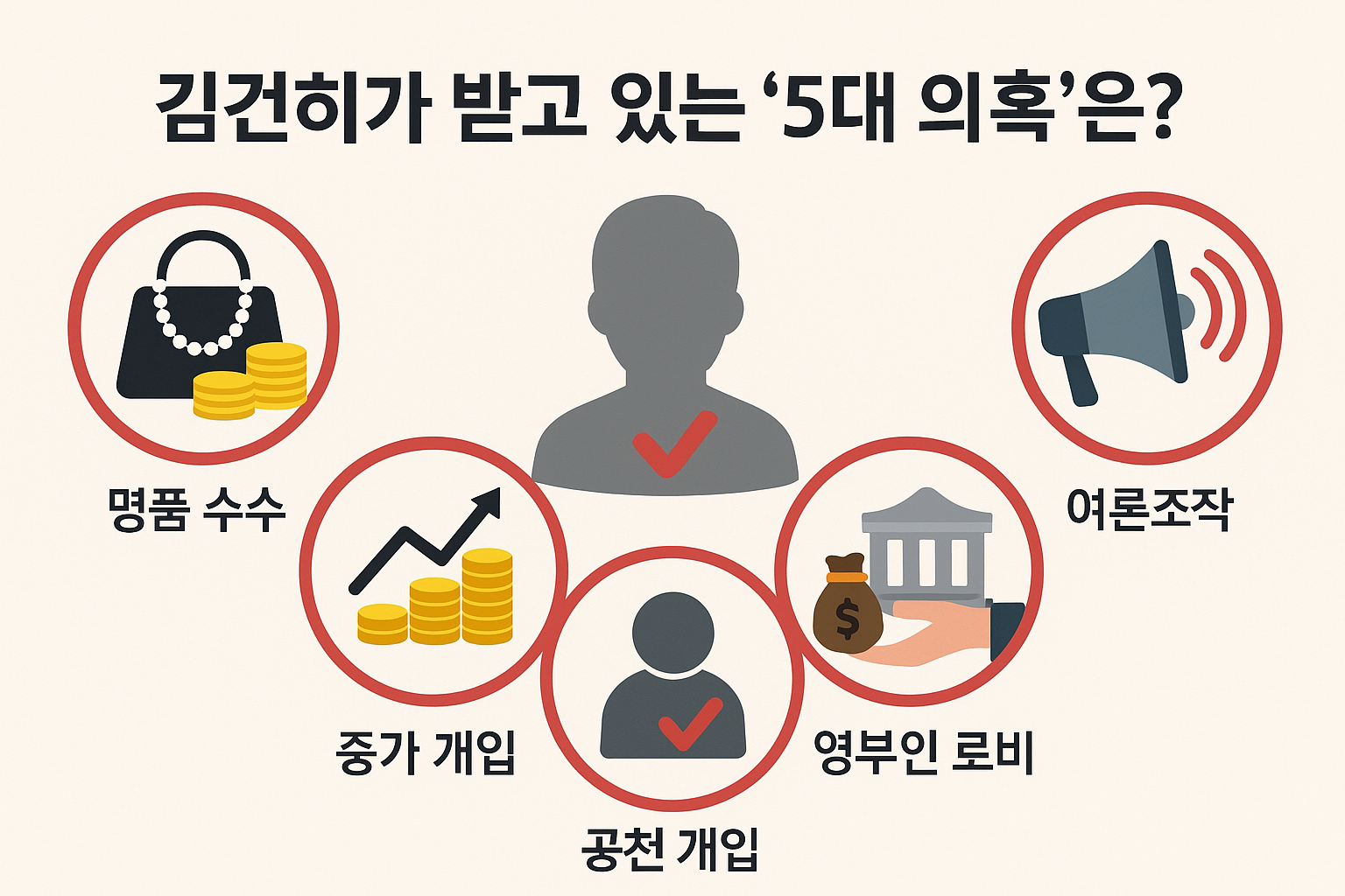 다음은 현재까지 확인된 김건희 여사의 핵심 혐의 5가지입니다.