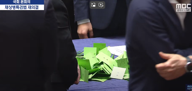 오늘 국회 본회에서 채상병 특검법안이 부결되었습니다. 총 투표수 299명 찬성 194 반대 104 무효 1표로 부결되었습니다.