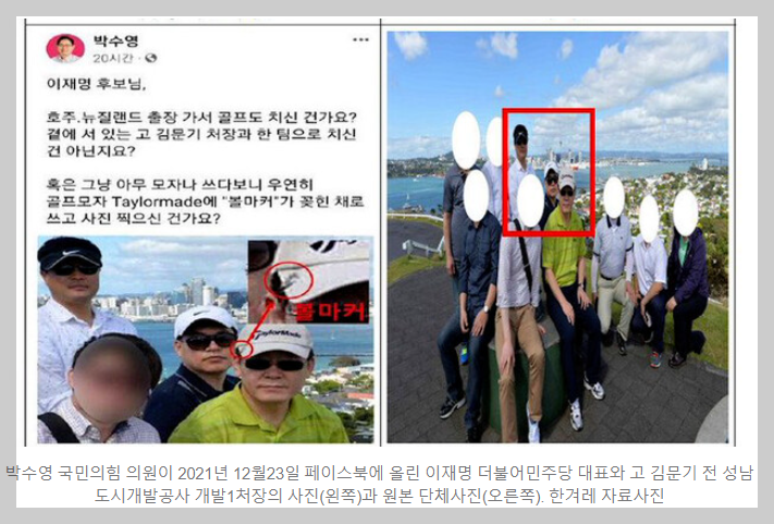 대선을 앞둔 2021년 12월 23일 국민의 힘 박수영 의원은 자신의 페이스북에 "이재명 후보님, 호주, 뉴질랜드 출장 가서 골프도 치신 건가요? 곁에 서 있는 고 김문기 처장과 한팀으로 치신 건 아닌지요?라는 글과 함께 사진을 게시했습니다.